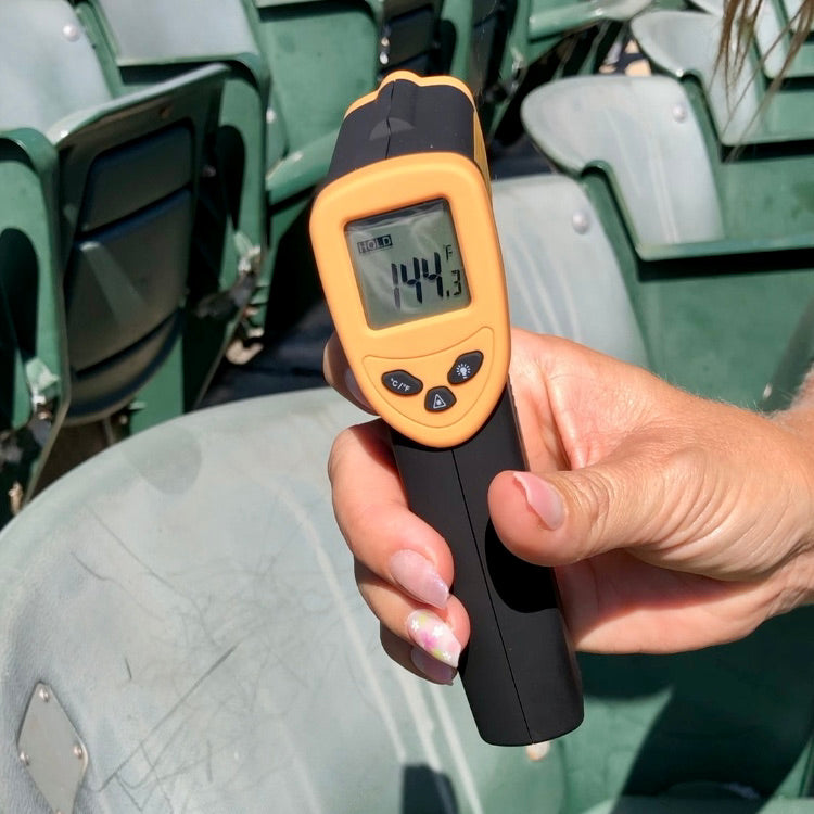 On an 80 degree day at a 1pm game, the seat registered 144 degrees Farenheit!! Who wants to sit on that? Not us! Protect your bum from the sun!